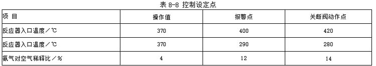 (2)氨儲存供應系統 計量的氨氣可依溫度和壓力修正系數進行修正。從煙氣側所獲得的no,信號饋入有計算所需氨氣流量的功能。控制器利用氨氣流量控制所需氨氣,使摩爾比維持固定。氦氣供應管線上有一個緊急關斷裝置,當入口煙氣溫度過低、過高或氨空氣稀釋比過高時,均與該裝置連鎖,迅速關斷,以確保操作安全和防止催化劑損壞。最初設定點見表8-8。