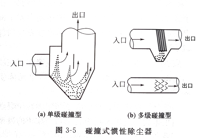 利用粉塵與氣體在運動中的慣性力不同,使粉塵從氣流中分離出來。在實際應用中實現慣性分離的一般方法是使含塵氣流沖擊在擋板上,使氣流方向發生急劇改變,氣流中的塵粒慣性較大,不能隨氣流急劇轉彎,便從氣流中分離出來。在慣性除塵方法中,除利用了粒子在運動中的慣性較大外,還利用了粒子的重力和離心力。